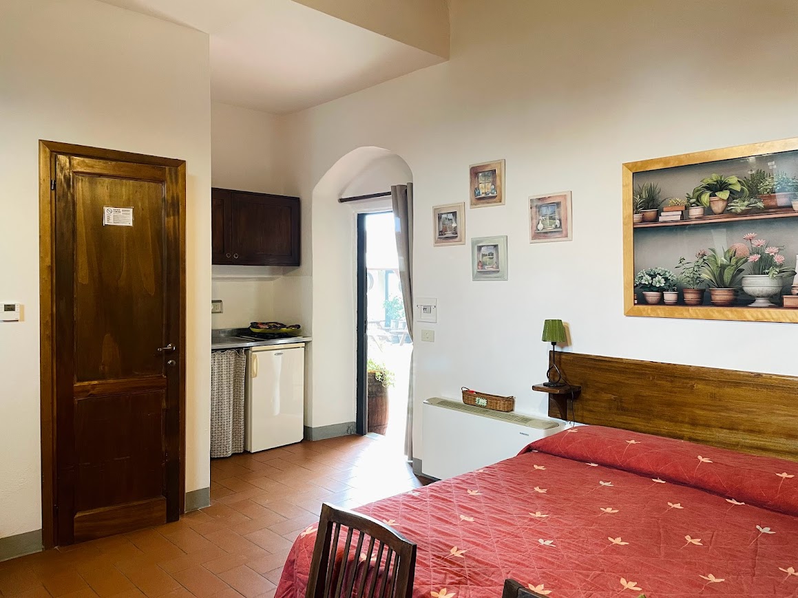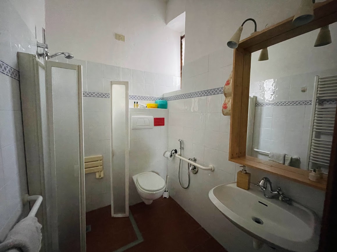 At the ground floor of the Main Building, GRANAIO al SOLE (Sunny Granary) and GRANAIO all’OMBRA (Shady Granary) were the places where threshed grain to feed farm animals was stored. The two rooms can be connected to form a comfortable apartment “Il GRANAIO” that will accommodate 4-5 people and accessible to the diversely able. The very typical vaulted terracotta brick ceiling and high windows that let the morning sun filter in, witness its authenticity. The two-room apartment consists in a large bedroom with double bed and 1 single bed, living room with 2 single beds and equipped kitchenette with dishes and cookware, a two-burner stove, refrigerator, sink. Each room has its own en suite bathroom with shower, as well as its own exit to outside area. Very comfortable for a Family or 2 couples.